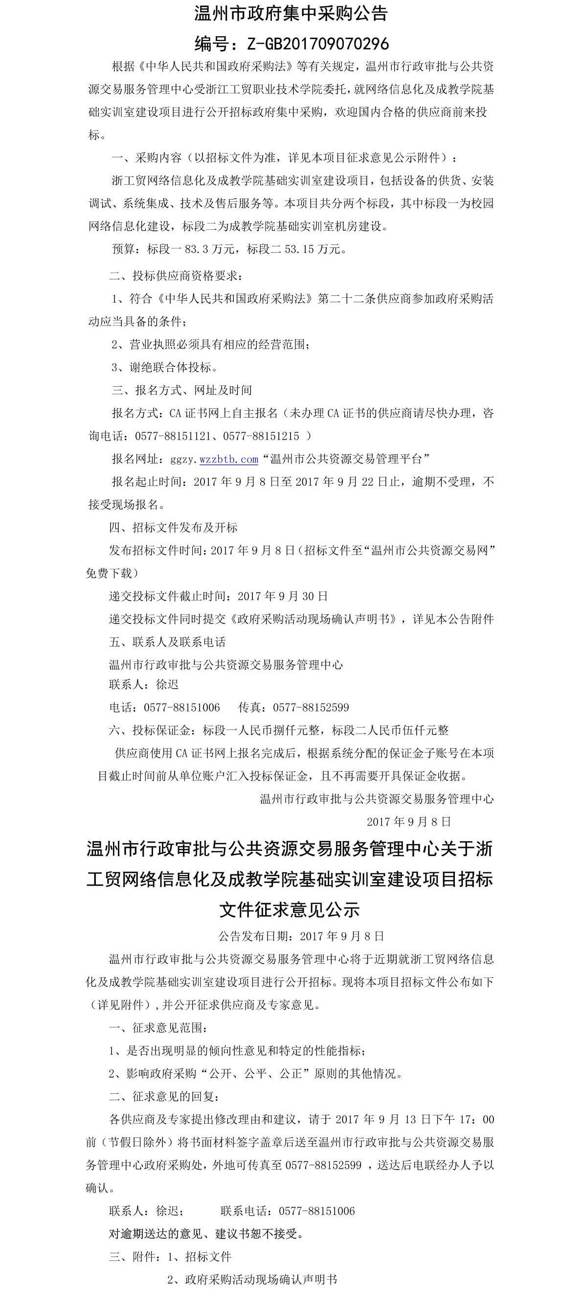 浙江工贸职业技术学院网络信息化及成教学院基础实训室建设项目公开招标公告