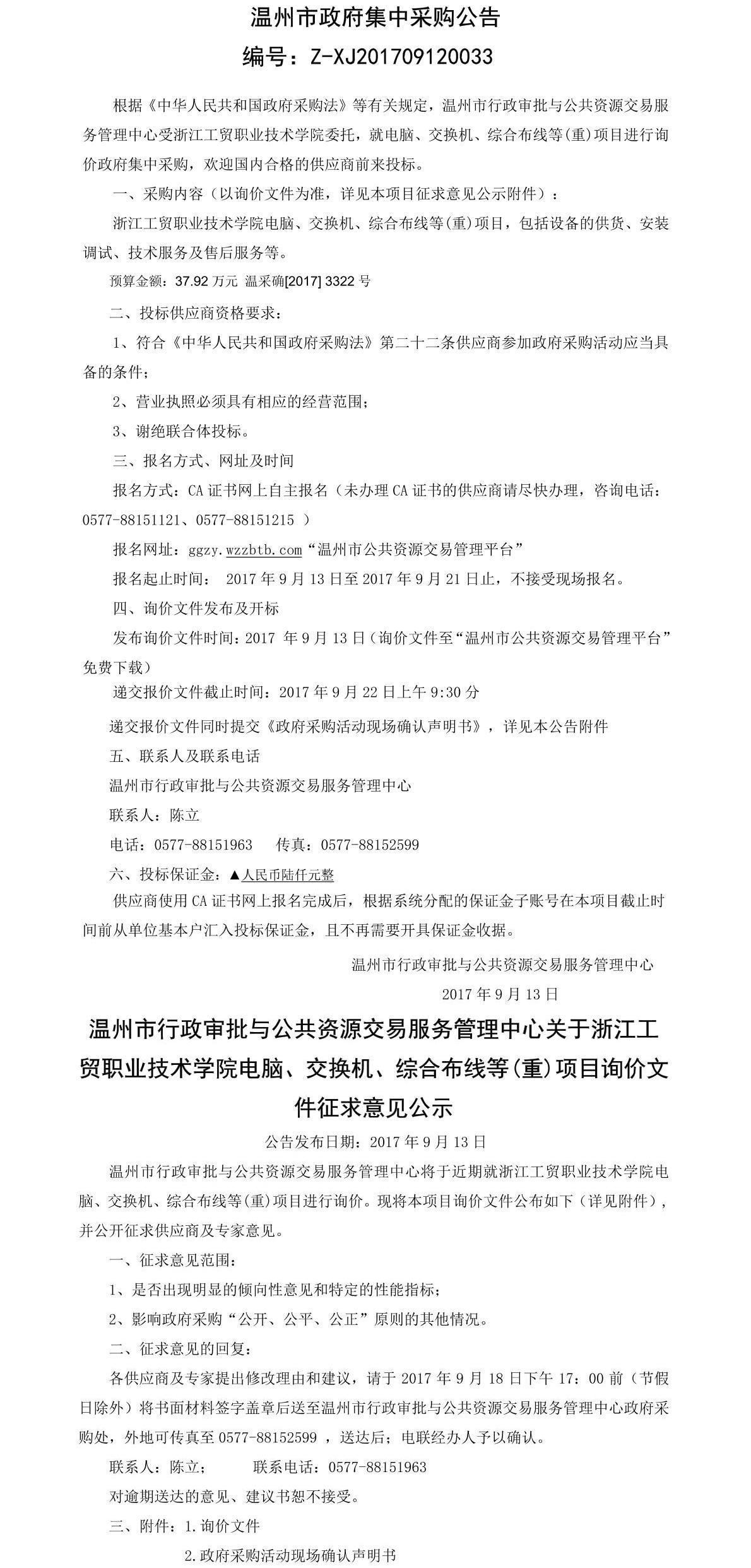 浙江工贸职业技术学院电脑、交换机、综合布线等(重)的公开招标公告