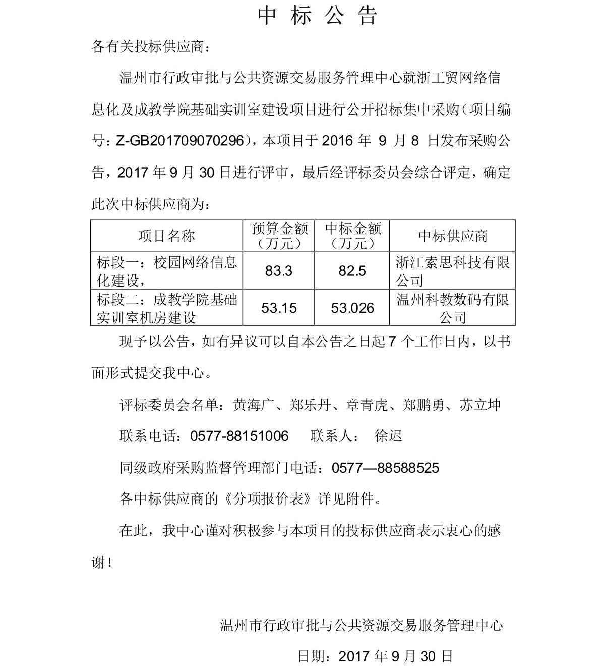 浙江工贸职业技术学院网络信息化及成教学院基础实训室建设的中标公告